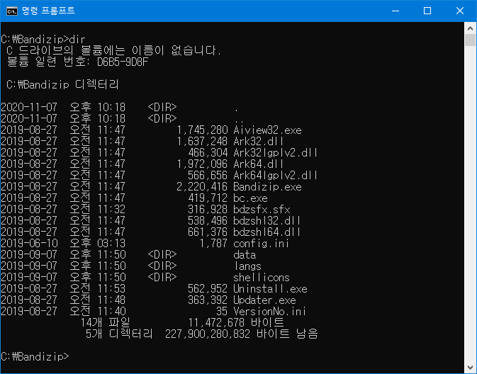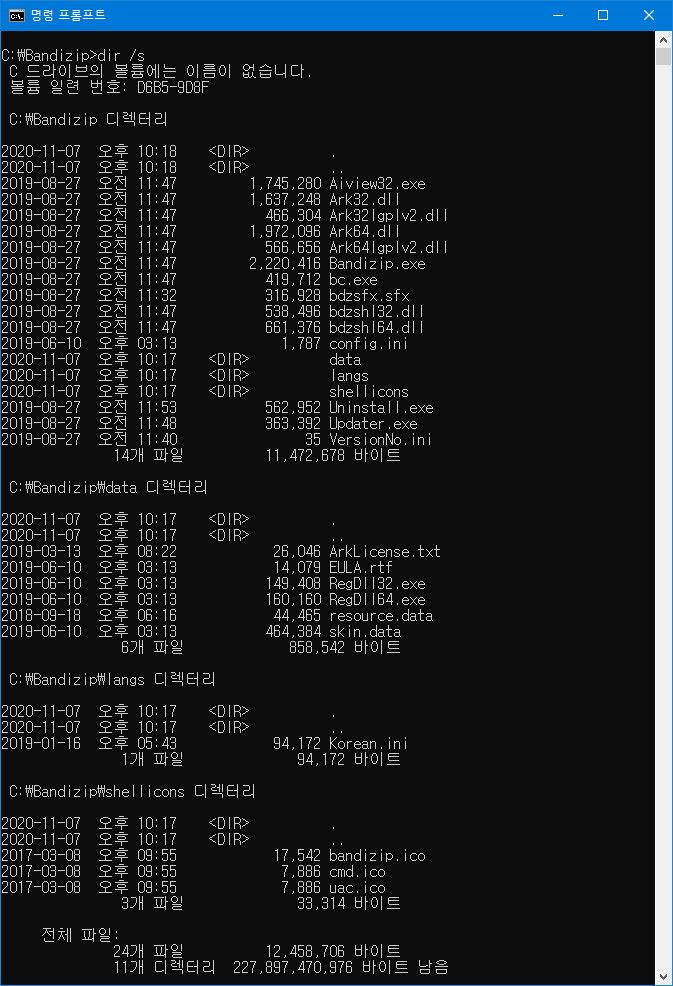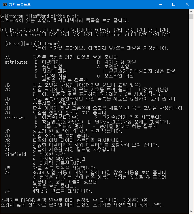 아래 그림은 명령 프롬프트에서 볼 수 있는 dir명령어의 설명이다.