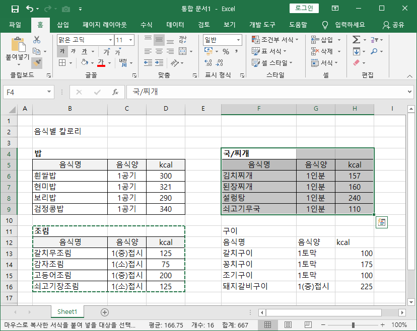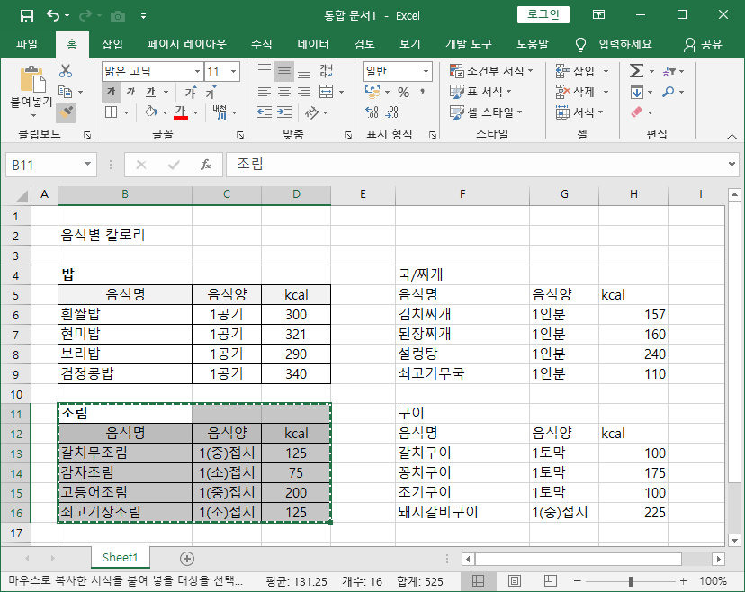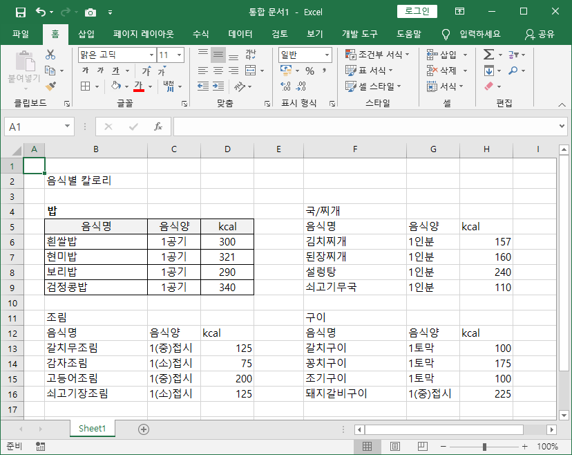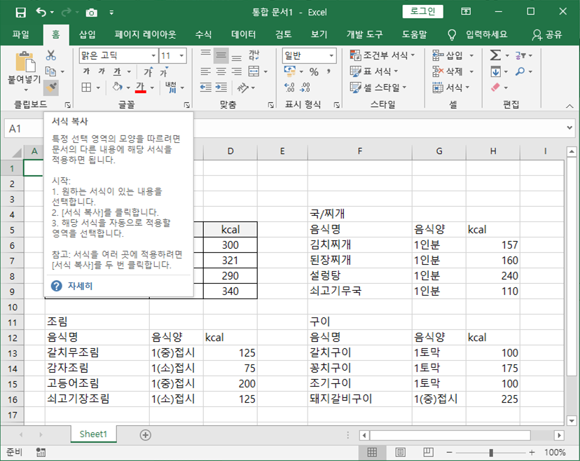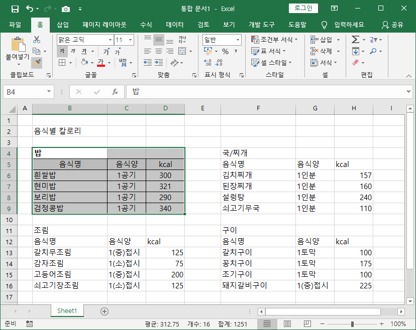 그림 1에서 밥에 관련된 표만 서식이 적용되어 있다.