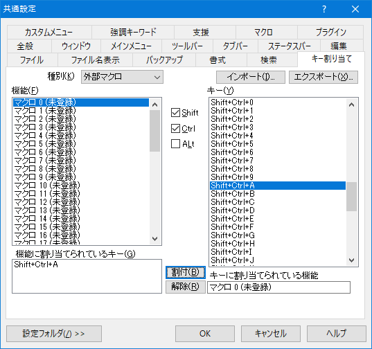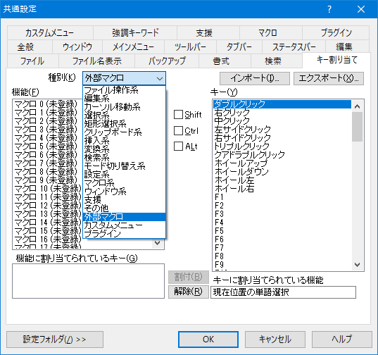 共通設定 에서 キー割り当て탭을 클릭한뒤, 種別에서 外部マクロ 를 선택한다.