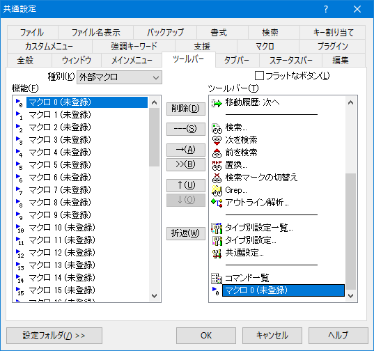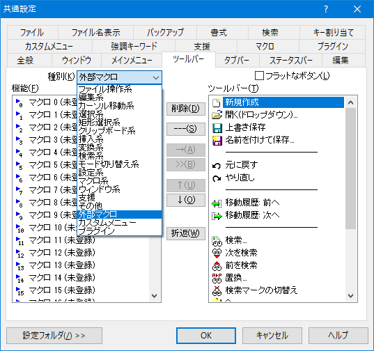 共通設定 에서 ツールバー탭을 클릭한뒤, 種別에서 外部マクロ 를 선택한다.