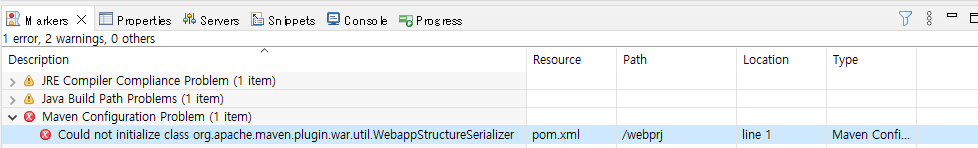 Could not initialize class org.apache.maven.plugin.war.util.WebappStructureSerializer pom.xml /webprj line 1 Maven Configuration Problem