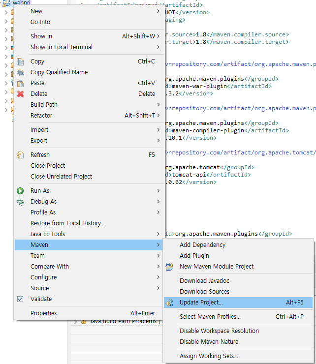 2.2. 프로젝트를 오른쪽 클릭한 뒤, Maven > Update Project... 를 클릭
